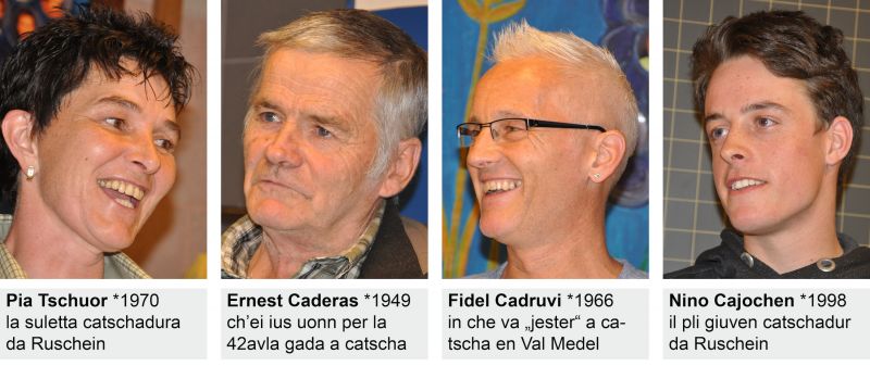 ... ei la stanza da scola 11 s’emplenida cun da quei da 50 persunas. Igl ei semussau puspei inaga che la catscha grischuna emplenescha buca mo las schelenteras igl atun, ella interessescha era la glieud. Ils quater hosps han raquintau en ina moda viva ed autentica da lur experientschas da catscha. Ed igl auditori ha tedlau cun plascher, cun rir denteren e cun grond interess tgei ch’ei vegniu dumandau e rispundiu. Per exempel quei che pertucca il prezi d’ina buis reschnova per in giuven catschadur ... ni ch’ins sa tremblar sco ina caglia suenter ch’ins ha tuc ina selvaschina ... ch’ins tegn endamen exact il liug, il gi e las uras ch’ins ha sittau zatgei extraordinari ... e ch’il vent, tut secund co el va, sa esser in excellent vischander ni in che lavaga tut da catscha.