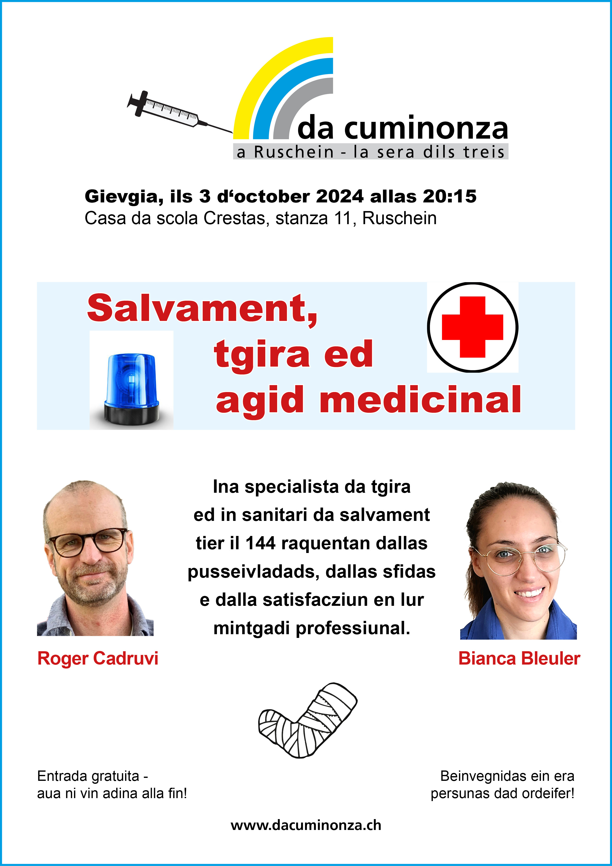 ... ein biebein 50 persunas stadas "da cuminonza" en la stanza da scola 11. Il tema "salvament, tgira ed agid medicinal" sa daventar actuals tier mintgin. Mo secapescha che las biaras persunas ein ledas sch'ellas ston buca ir el spital u far diever dil clom d'agid 144. Sch'ellas san denton, ch'ellas fussen el seracass en buns mauns, sche sa quei patratg gia esser in confiert.