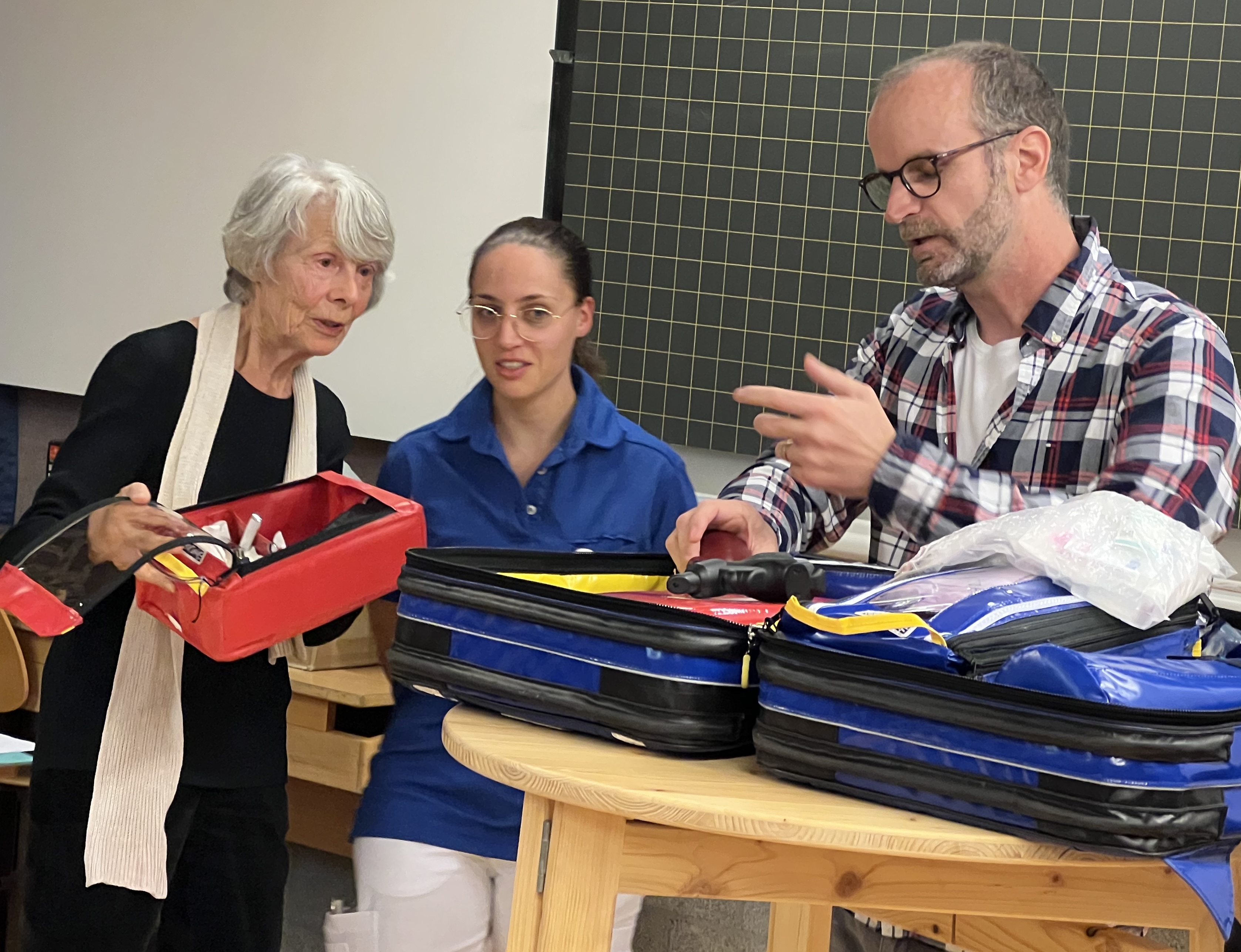 Roger Cadruvi (44 onns, sanitari da salvament) ha raquintau dad in cass da salvament che seigi capitaus dacuort. In um en in negozi grond eri cupitgaus e savevi buca star pli sin atgnas combas. Mo avon che seschar transportar dil 144 hagi el giu aunc da tuttas sorts giavischs: ch'ei vegni pachetau e pagau sias cumpras e ch'el drovi aunc gasettas e cigarettas ... Cass da bagatella detti ei adina puspei en sia lavur. El veva priu cun el a "da cuminonza" il sacados da salvament ed el ha priu dapart il cuntegn e presentau quel en detagl al publicum: p.ex. ina sort etui cun en massa medicaments en pigns pigns guoters, utensils per sustener la respiraziun, plasters e faschas per blessuras.
