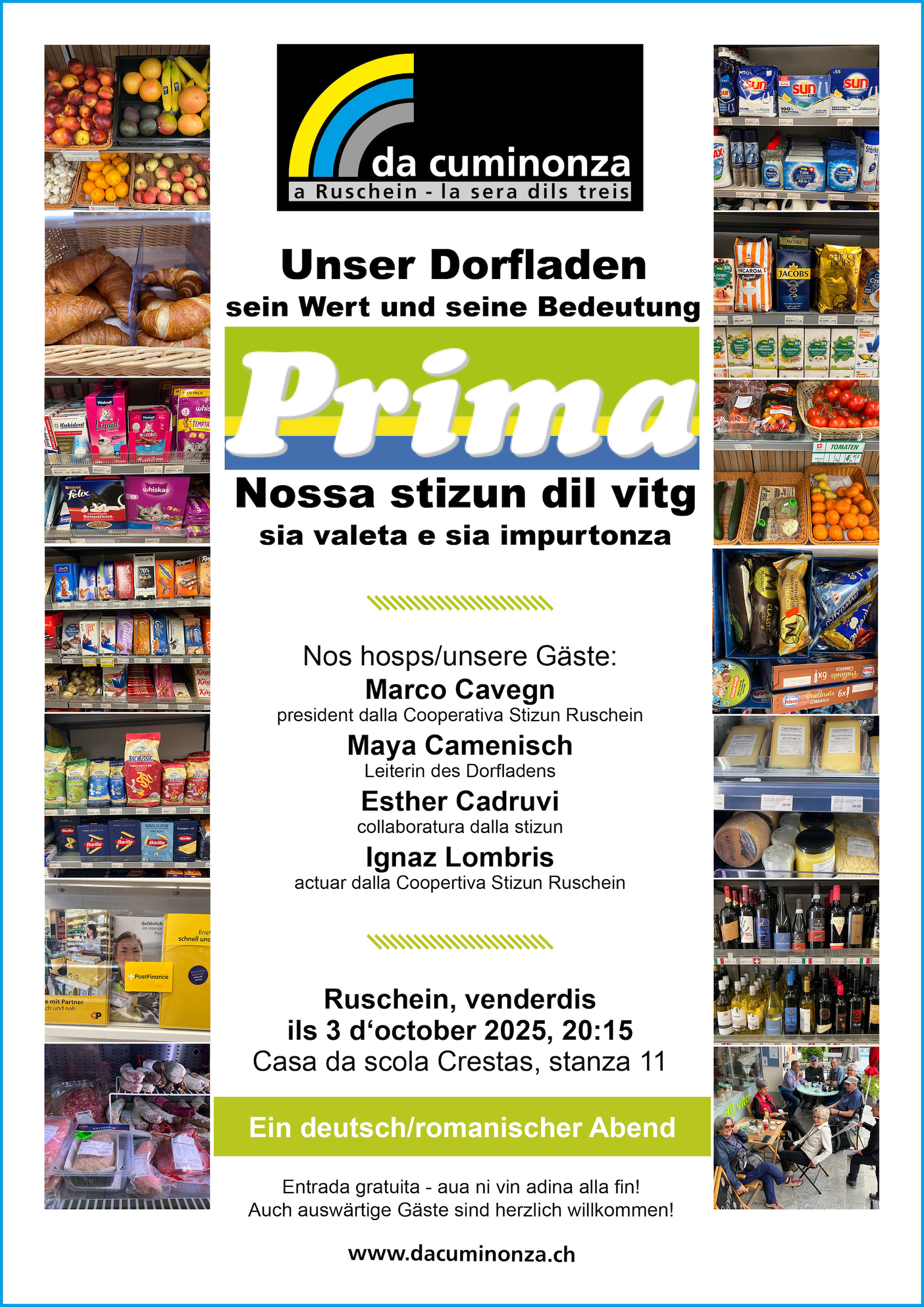 ... ein bunamein 60 persunas seradunadas per raquintar e tedlar co ch'ei stat cun la stizun dil vitg. Ein deutsch/romanischer Abend war angekündigt. En sia introducziun ha Andreas Joos purtau in citat da Henry Ford: "Ein Geschäft, das nur Geld einbringt, ist ein schlechtes Geschäft." Viu aschia ei la stizun dil vitg ina "buna fatschenta". Der Dorfladen - das hat sich im Laufe des Abends erwiesen - ist nämlich viel mehr als "nur" ein Laden. La stizun ei in liug da sentupada. An diesem Treffpunkt werden Informationen ausgetauscht. Cheu stat ins, dat ina paterlada e senta ch'ins fa part dad ina cuminonza.