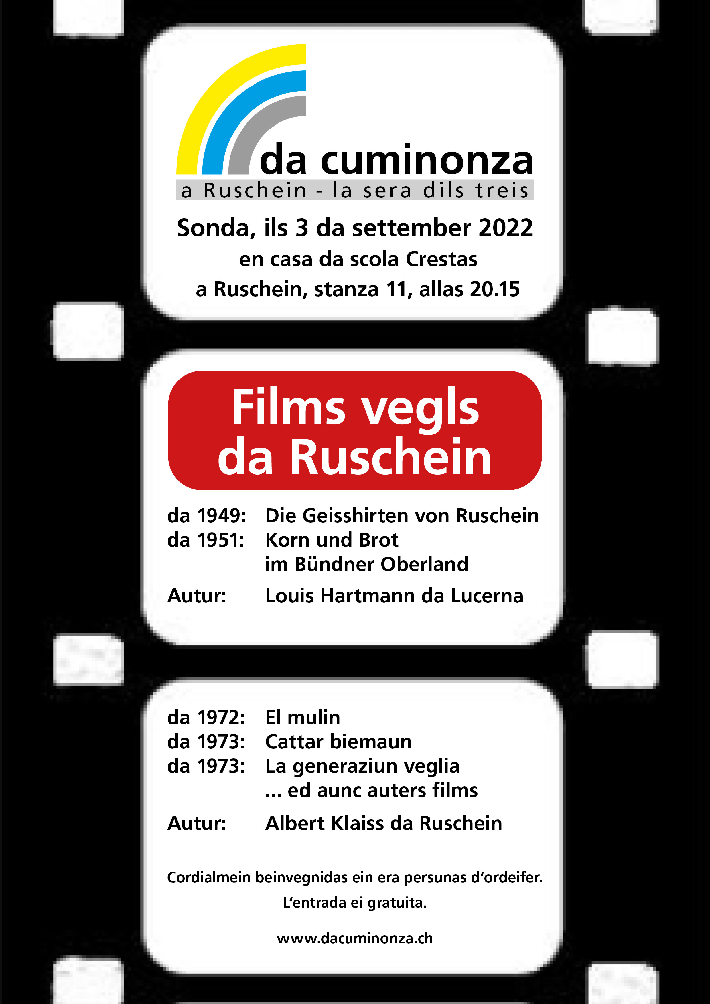 ... han varga 60 persunas mussau interess per "films vegls da Ruschein". Era d'ordeifer ein enzacons hosps vegni. Und da es unter den zahlreichen Besuchern auch einige "nicht-romanisch-verstehende Gäste" hatte, moderierten wir den Abend zweisprachig. Die Filme hatten ohnehin ihre eigene Sprache. Es waren alles Stummfilme. Die ersten zwei, die vor ungefähr 70 Jahren gedreht wurden, waren in schwarz/weiss, mit deutschen Zwischentiteln strukturiert und mit Musik unterlegt, die anderen sieben, vor ungefähr 50 Jahren realisiert, waren in Farbe. Ils films veva il Museum Regiunal Surselva mess a disposiziun a nus per "da cuminonza a Ruschein - la sera dils treis" e nus vein astgau copiar e scursanir els. Aschia ha ei dau ord pliras uras "films originals" in mosaic variont da biebein 45 minutas cun las suandontas producziuns.