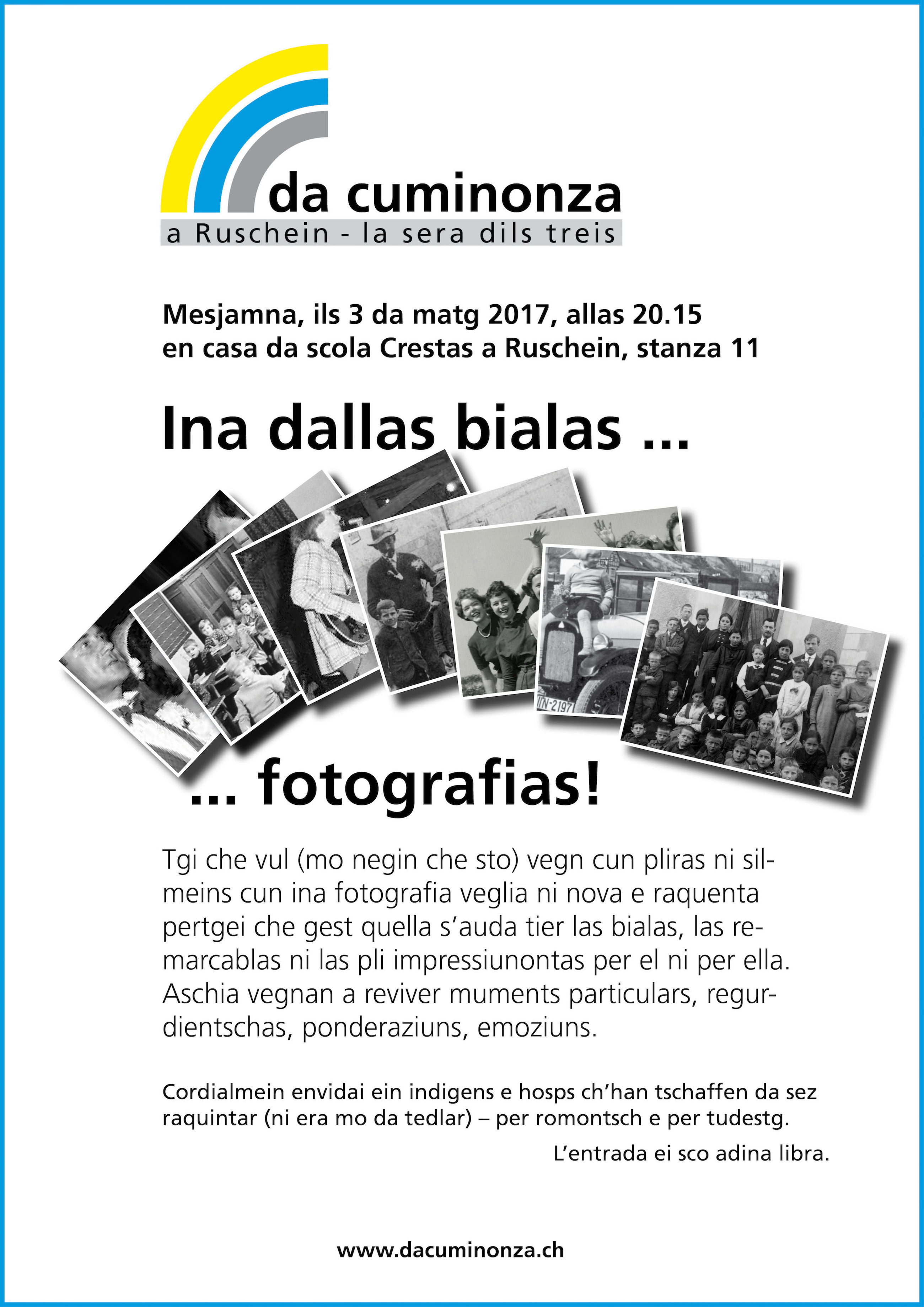 ... havein nus saviu festivar in pign giubileum: la 10avla occurrenza „da cuminonza a Ruschein la sera dils 3 dil meins“. Il tema dalla sera: Ina dallas bialas – fotografias. Igl ei semussau che era seras cun ina participaziun pli mudesta san esser per las persunas presentas seras gartegiadas e purtar in grond enrihament, dabia divertiment, plascher ed informaziun.